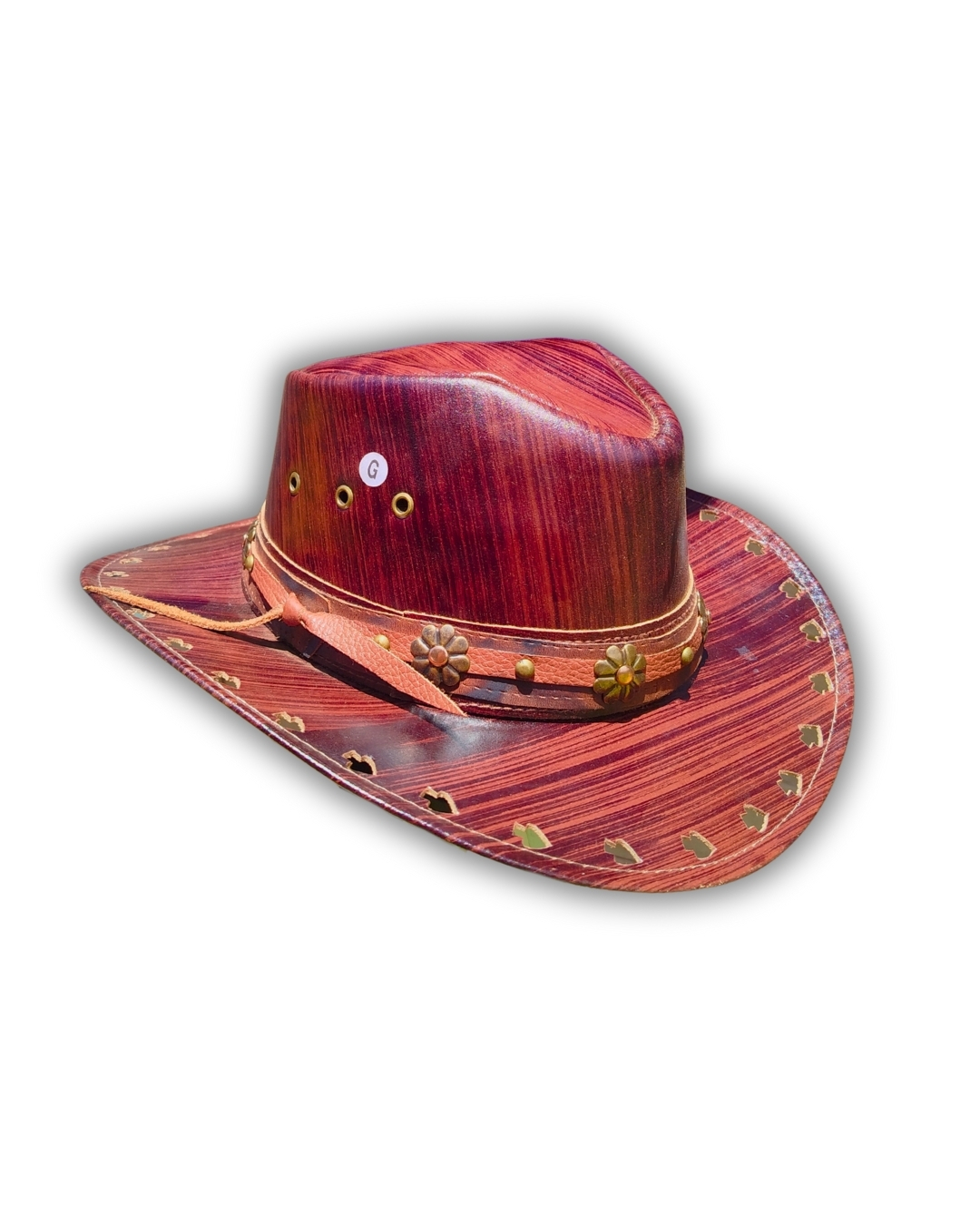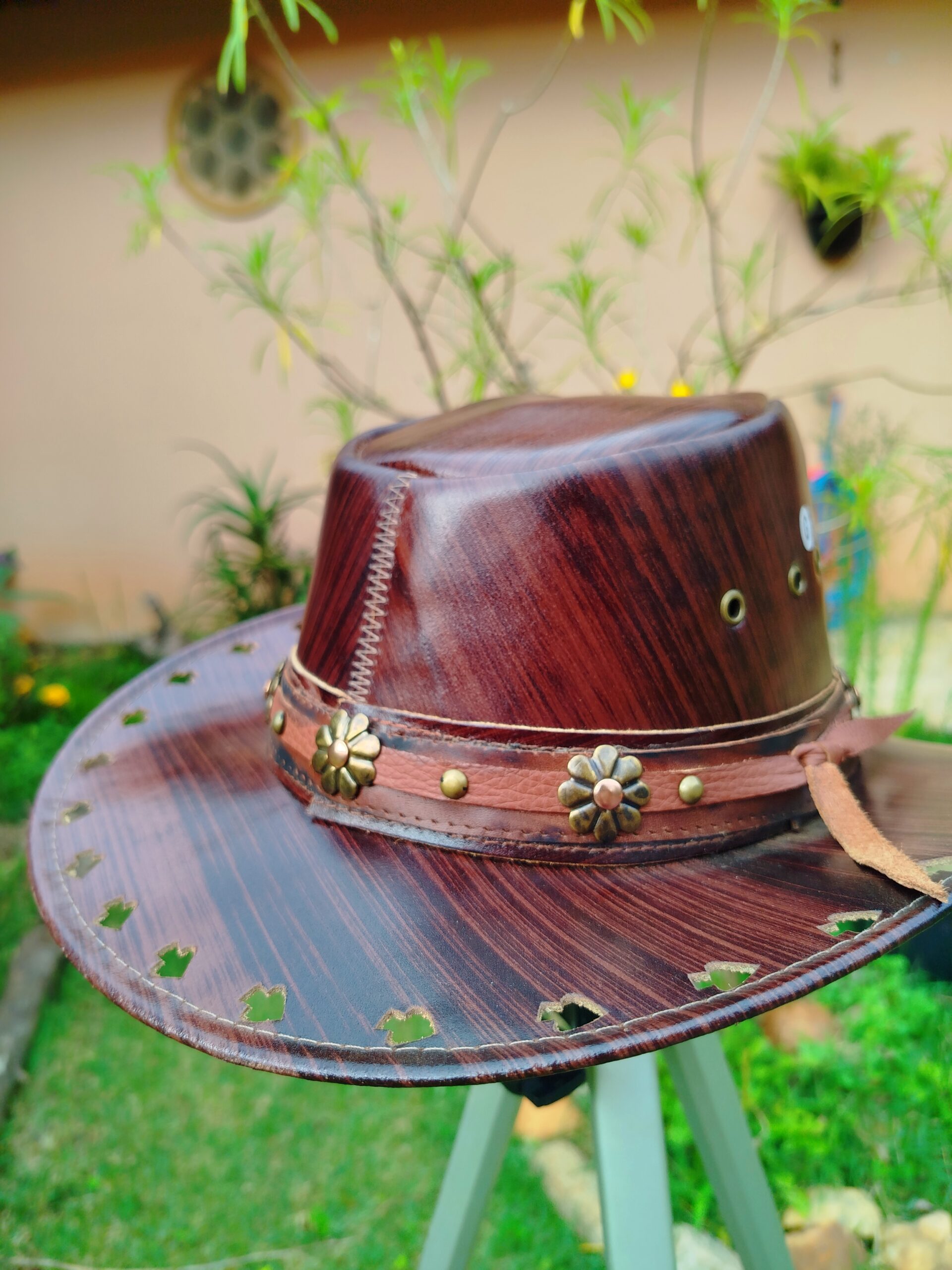 O diferencial desta peça está na riqueza dos detalhes. Logo, desde os recortes geométricos aplicados manualmente na aba, até a cinta em couro com flores metálicas envelhecidas que evocam tradição e espírito livre. A copa estruturada e as linhas orgânicas revelam um design autoral, ideal para quem busca estilo marcante, original e com alma artesanal.