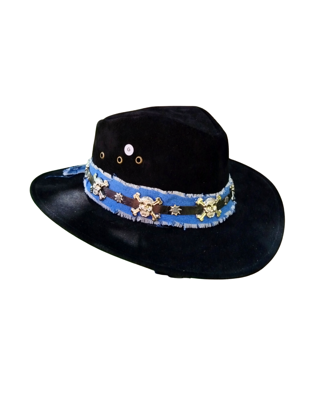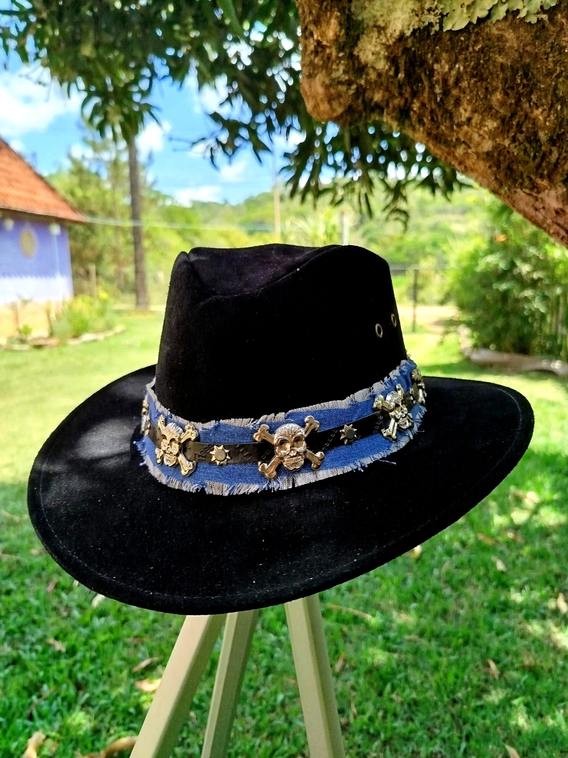 O Chapéu High Custom Caveira em Camurça é uma fusão entre o rústico e o moderno. Sua textura macia e opaca contrasta com os metais reluzentes da faixa, criando uma estética ousada e elegante ao mesmo tempo. A presença das caveiras simboliza força, igualdade e coragem, elementos que reforçam o espírito livre e destemido de quem o veste.