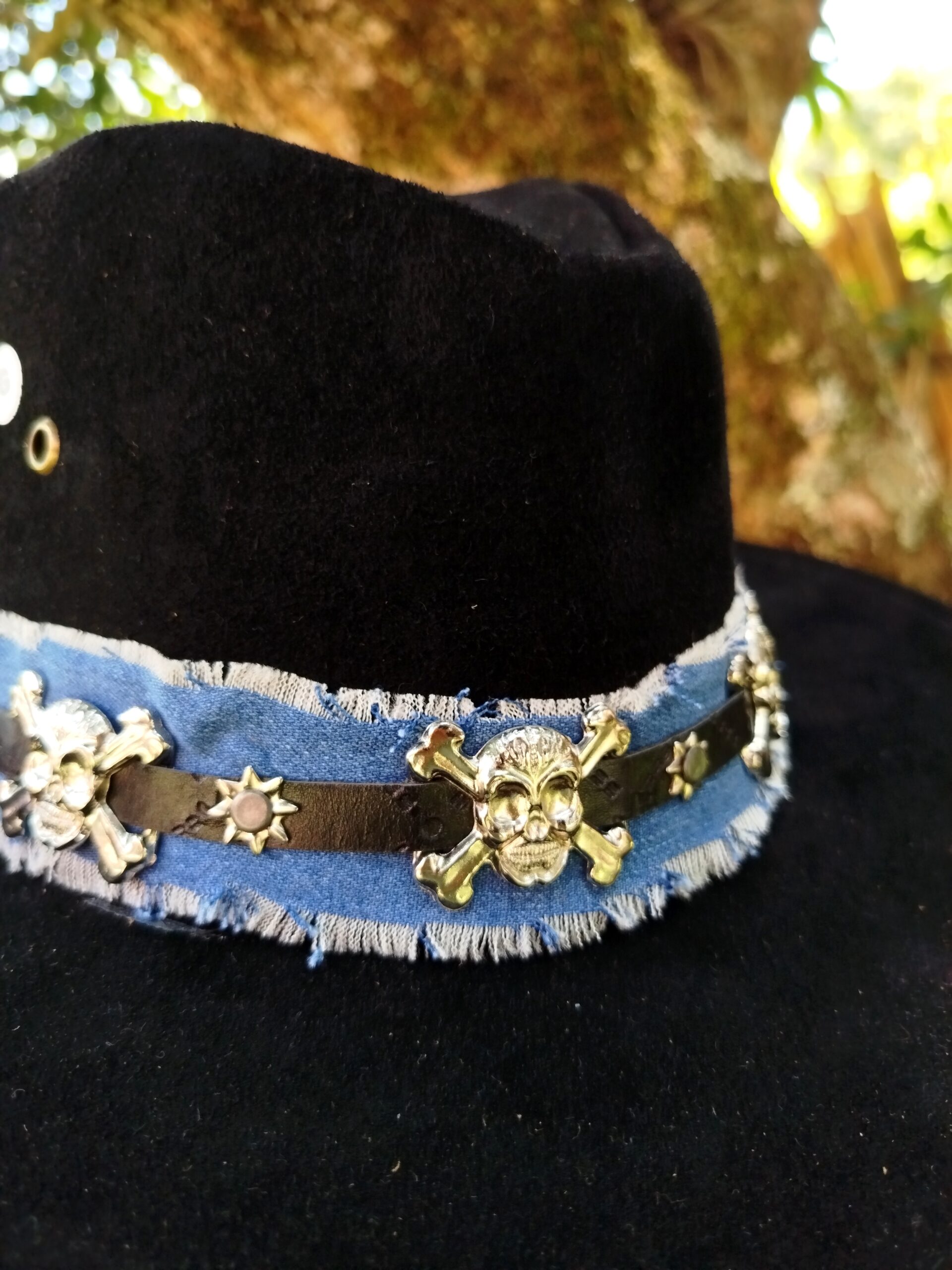 Faixa: Cinta em jeans azul com fita preta central e apliques metálicos de caveiras e estrelas, em alto relevo prateado