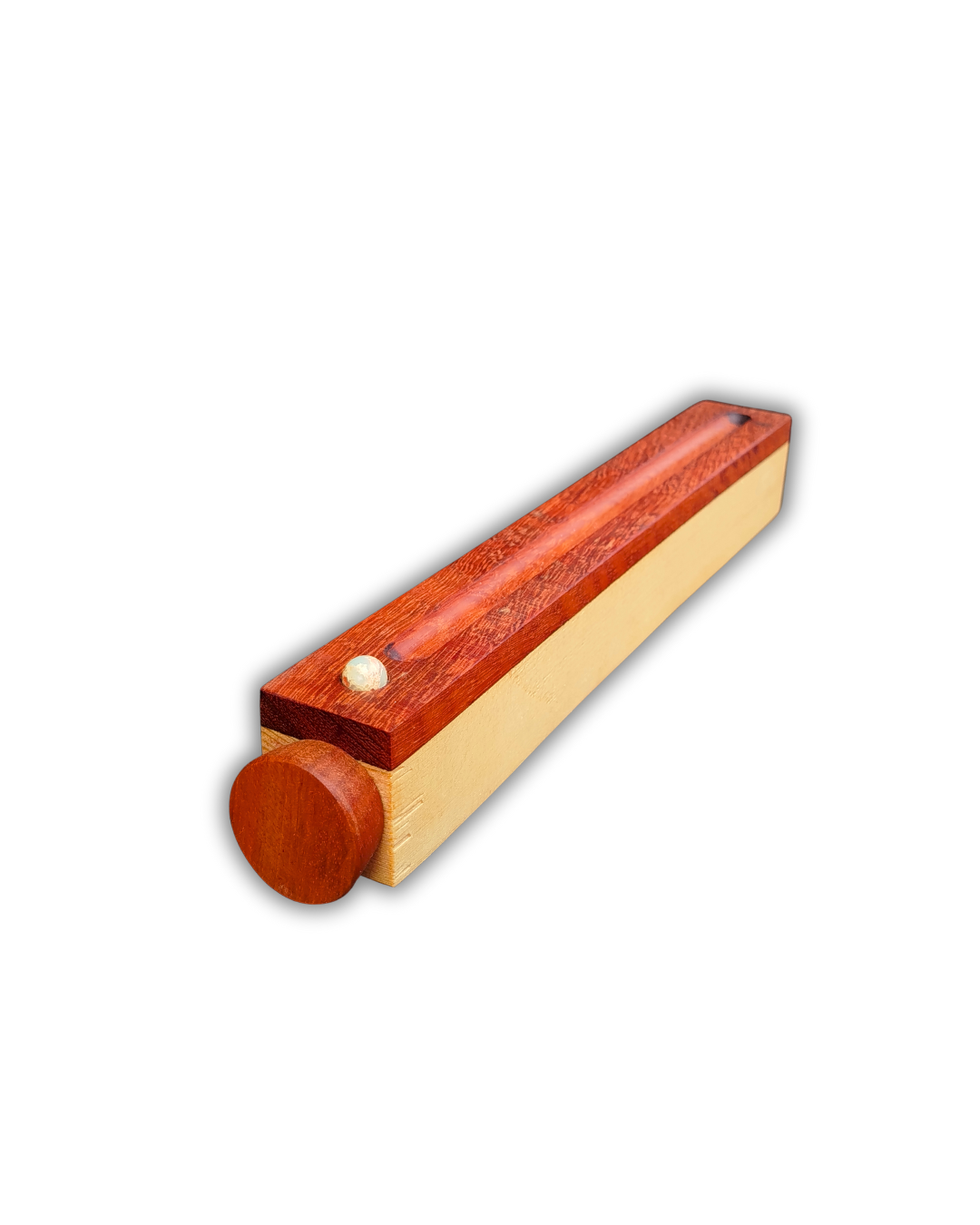 Além da base para coletar as cinzas do incenso ser feita de Madeira Nobre, o suporte que segura a vareta é de cristal de Jaspe. Além disso, este modelo conta com um compartimento embutido na base, fechado com rolha também de madeira, para armazenar os incensos e protegê-los da umidade.