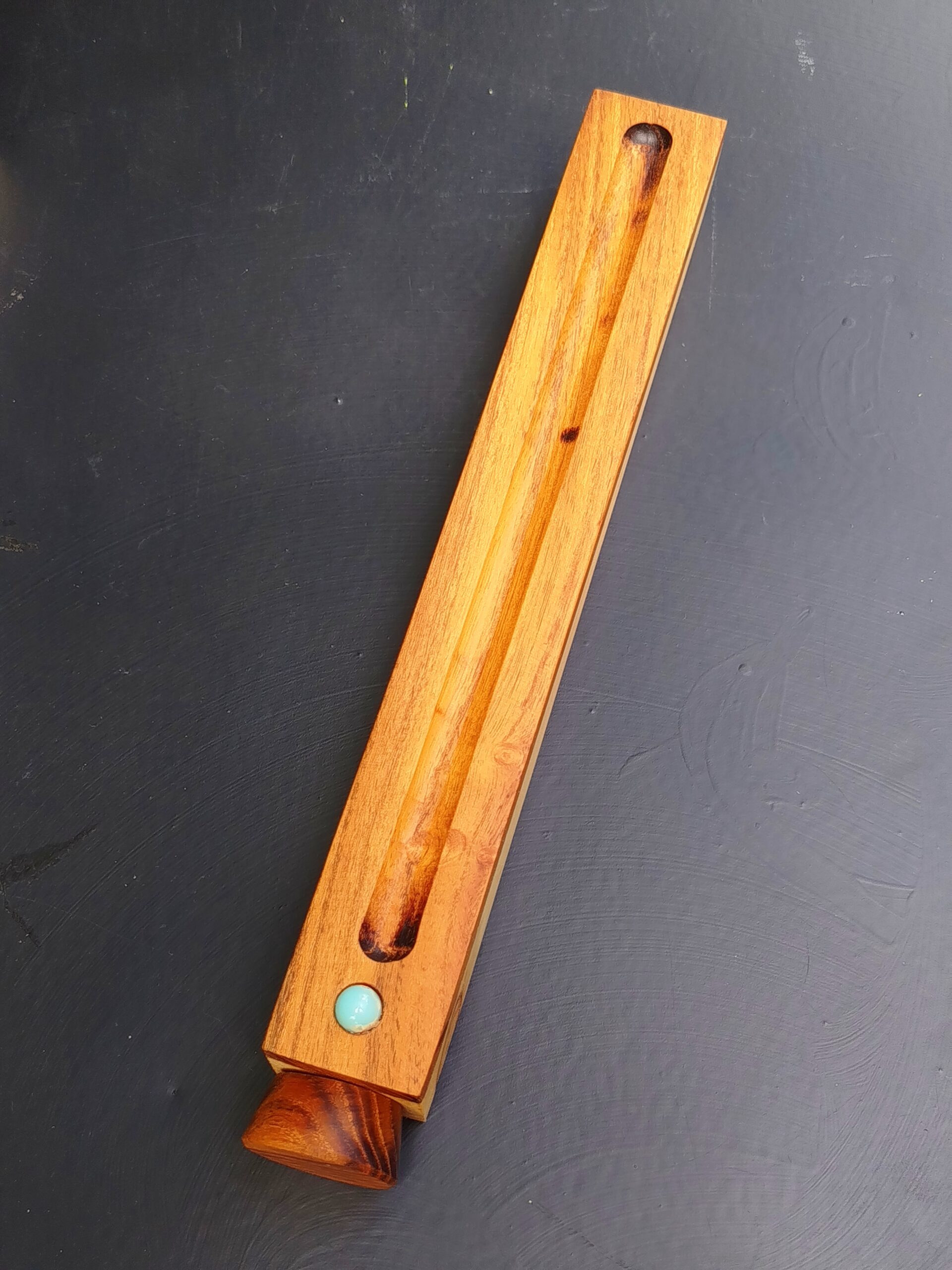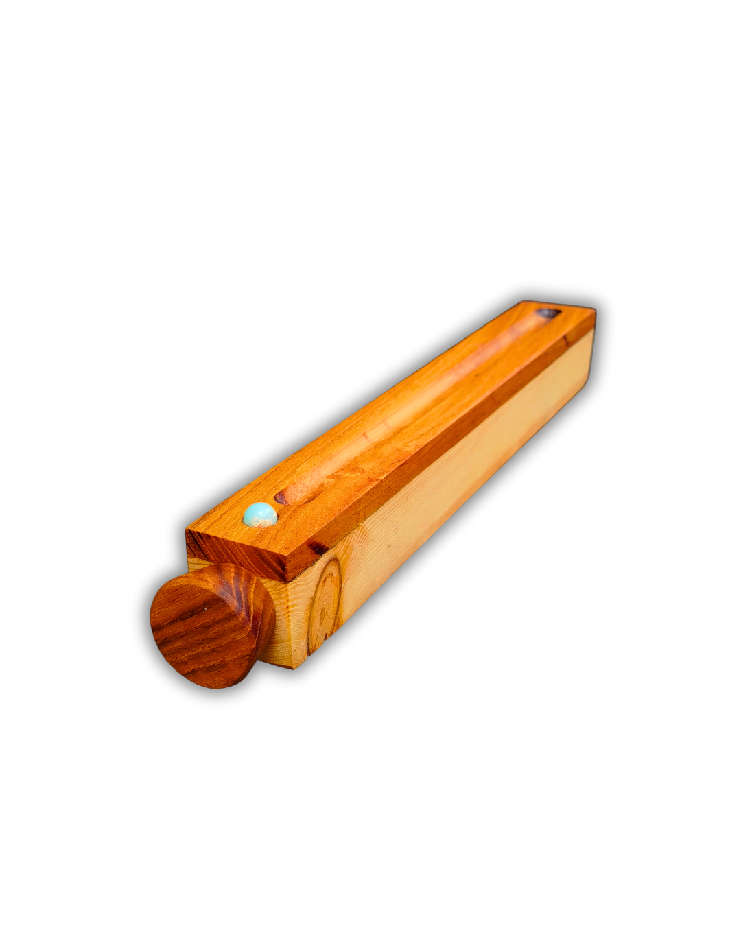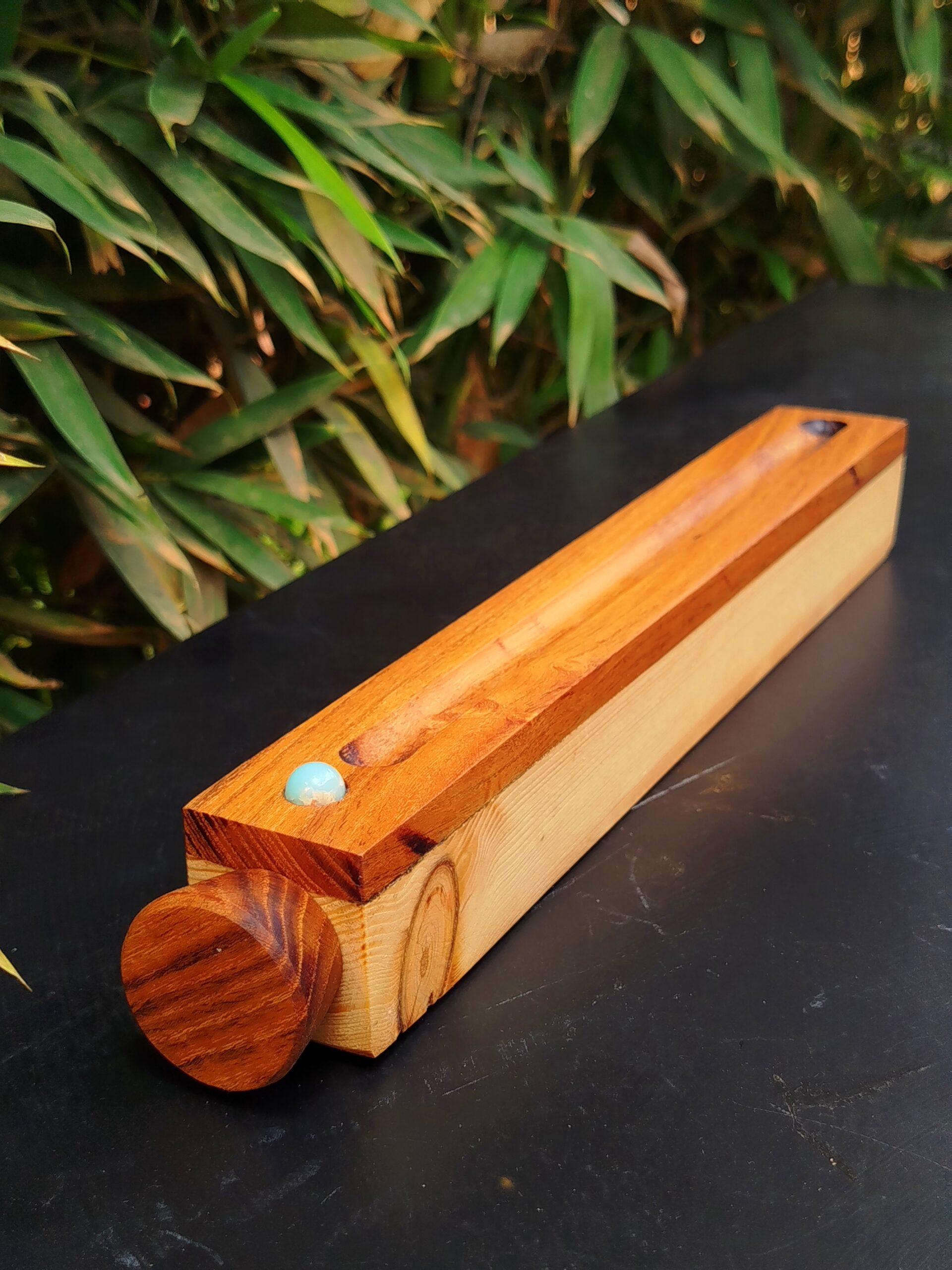 Além da base para coletar as cinzas do incenso ser feita de Madeira Nobre, o suporte que segura a vareta é de cristal de Jaspe. Além disso, este modelo conta com um compartimento embutido na base, fechado com rolha também de madeira, para armazenar os incensos e protegê-los da umidade.