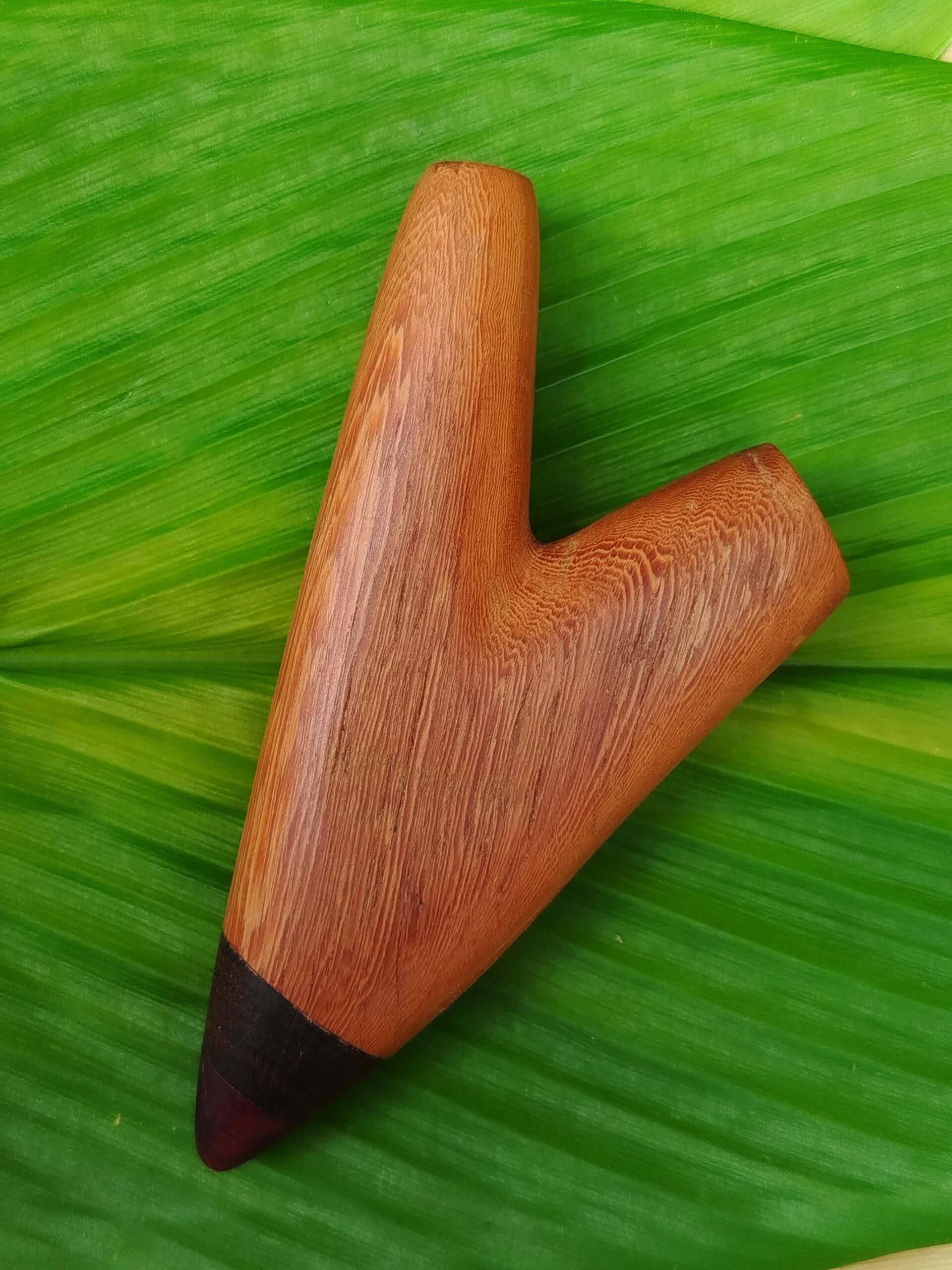 Seu formato anatômico e encaixe universal proporcionam um sopro limpo, direto e preciso, por isso é ideal para quem busca praticidade, durabilidade e alinhamento energético. Além disso, o acabamento em cera natural protege a madeira sem interferir na energia do instrumento, tornando-o adequado para meditação, concentração e cerimônias.